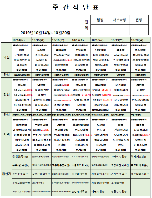 10월 3주차 주간식단표