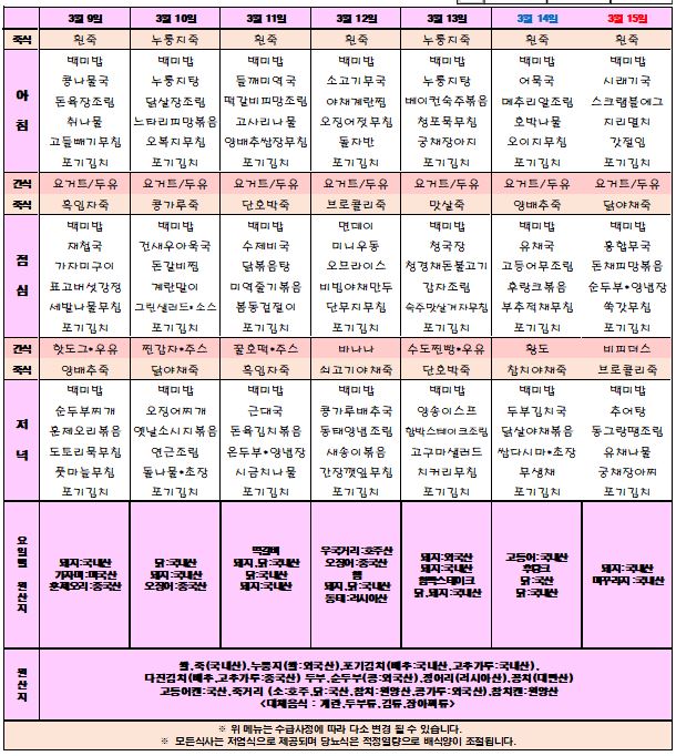 26년 3월 2주차 식단표