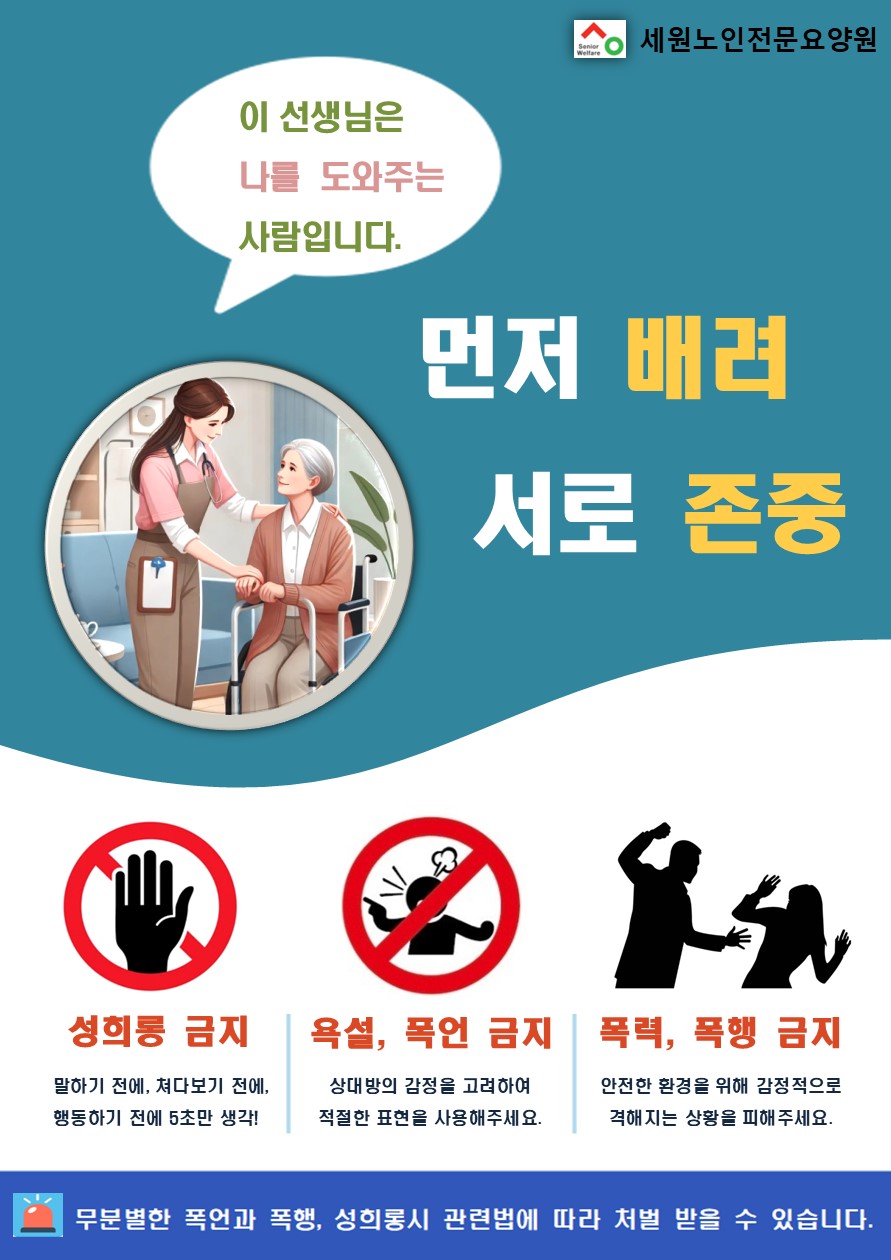2026년 성희롱,폭언,폭행 예방 안내문 공지 페이지 정보 작성자 세원요양원 작성일26-01-02 13:44 조회55회 댓글0건 관련링크 이전글 다음글 목록 본문 2026년 성희롱,폭언,폭행 예방 안내문 공지 댓글목록 등록된 댓글이 없습니다. 이전글 다음글 목록