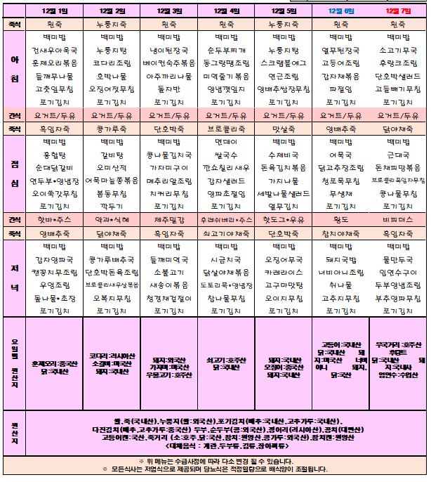 25년 12월 1주차 식단표