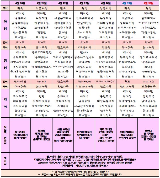 4월 4주차 식단표