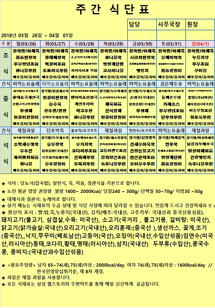 3월 26일 ~ 4월 01일 주간 식단표입니다.